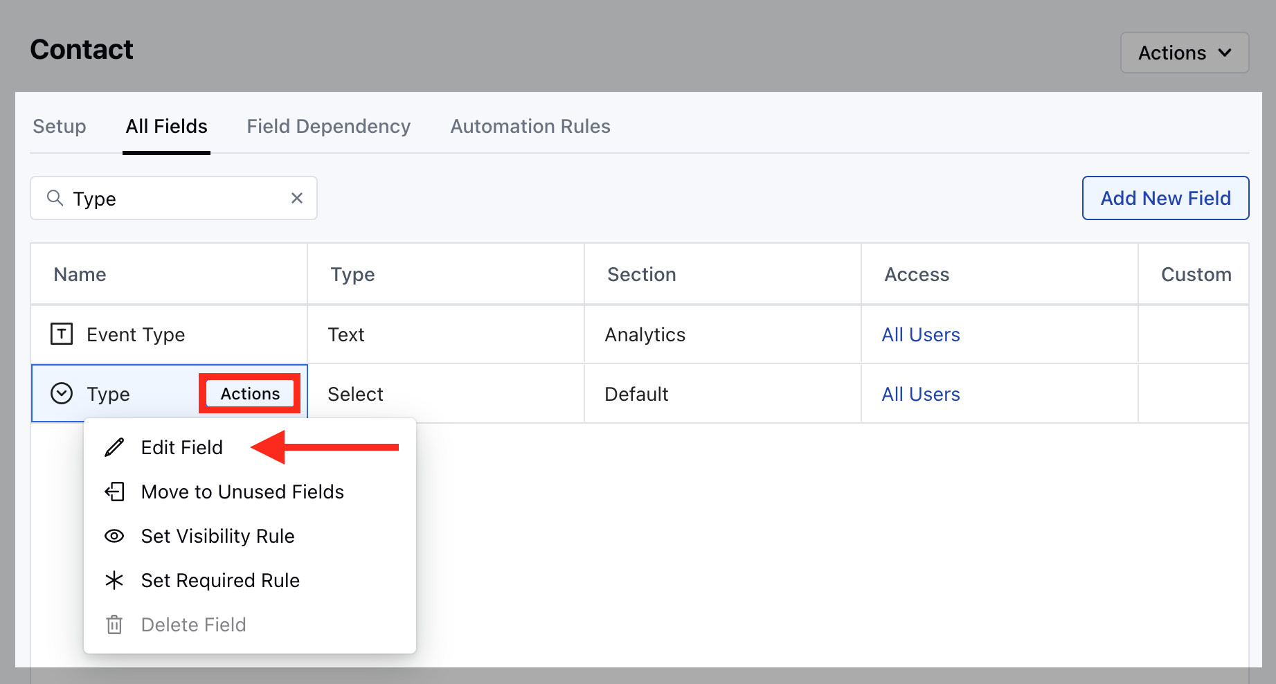 - Search for Type field and hover over it, Action button will appear