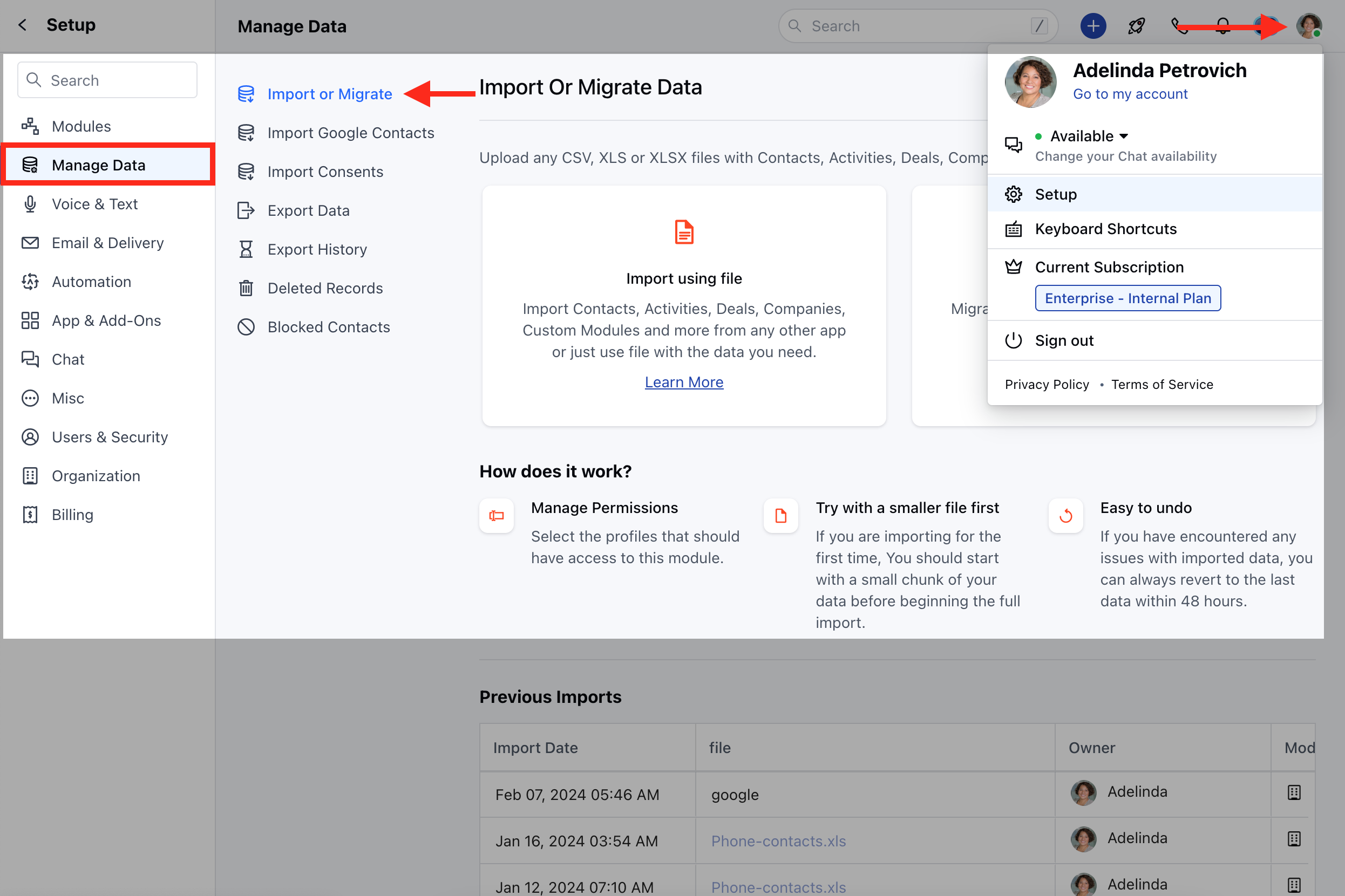 To access Import Wizard please follow the below steps :- Navigate to the Profile Icon at the top right corner