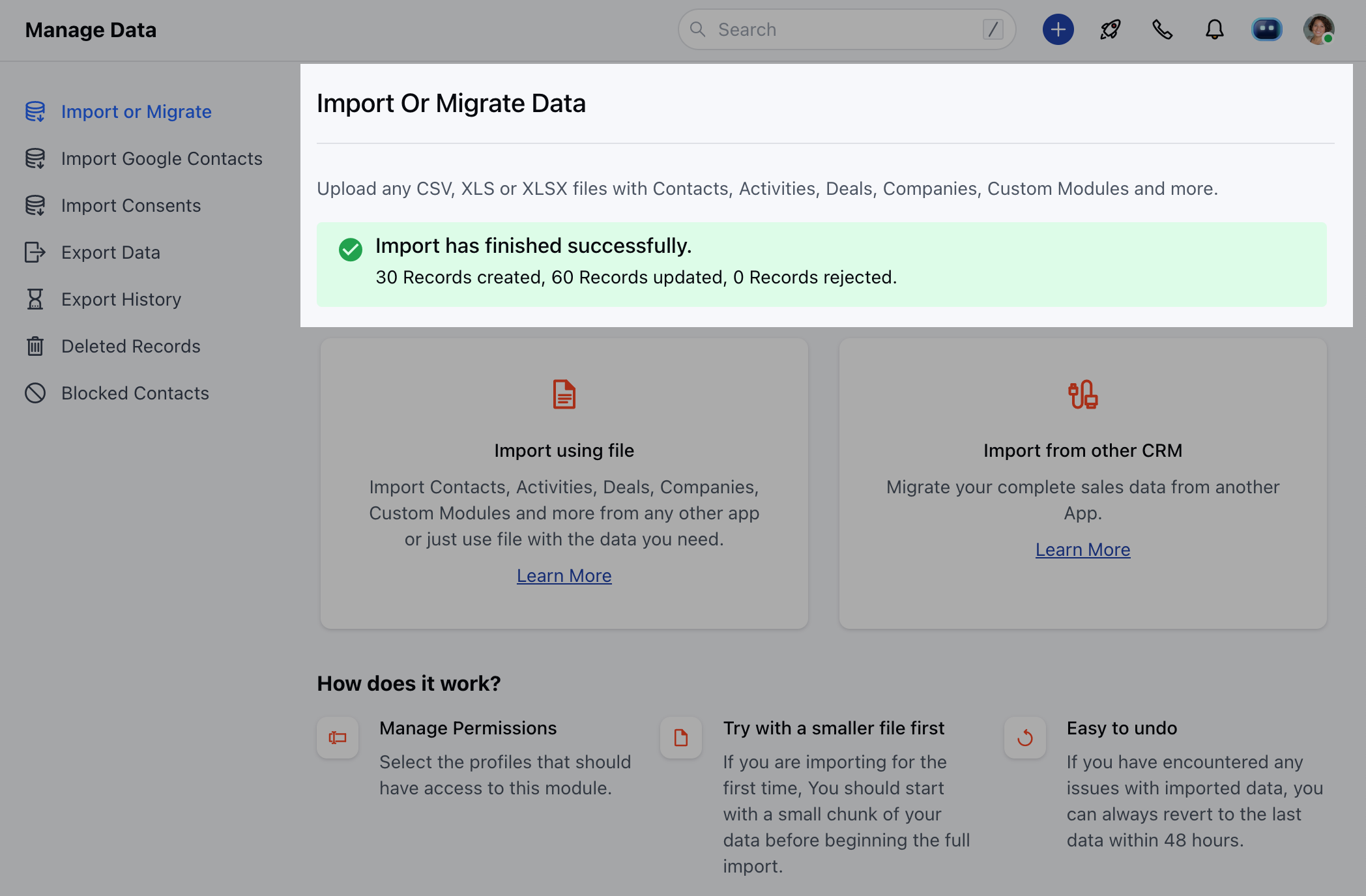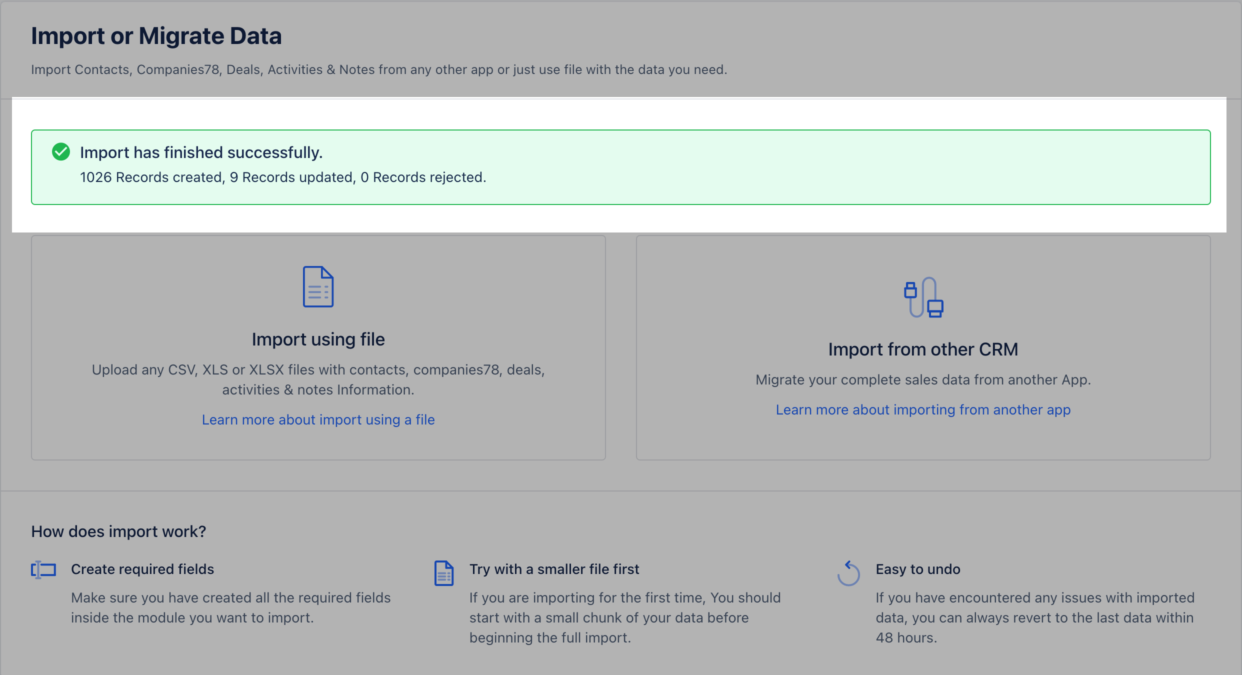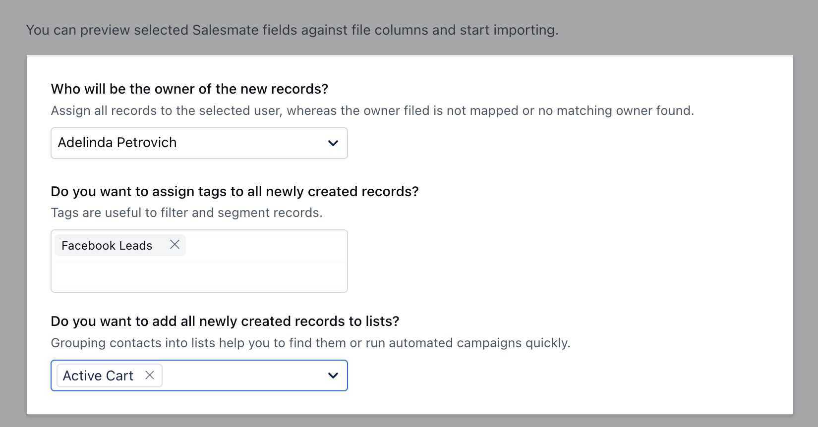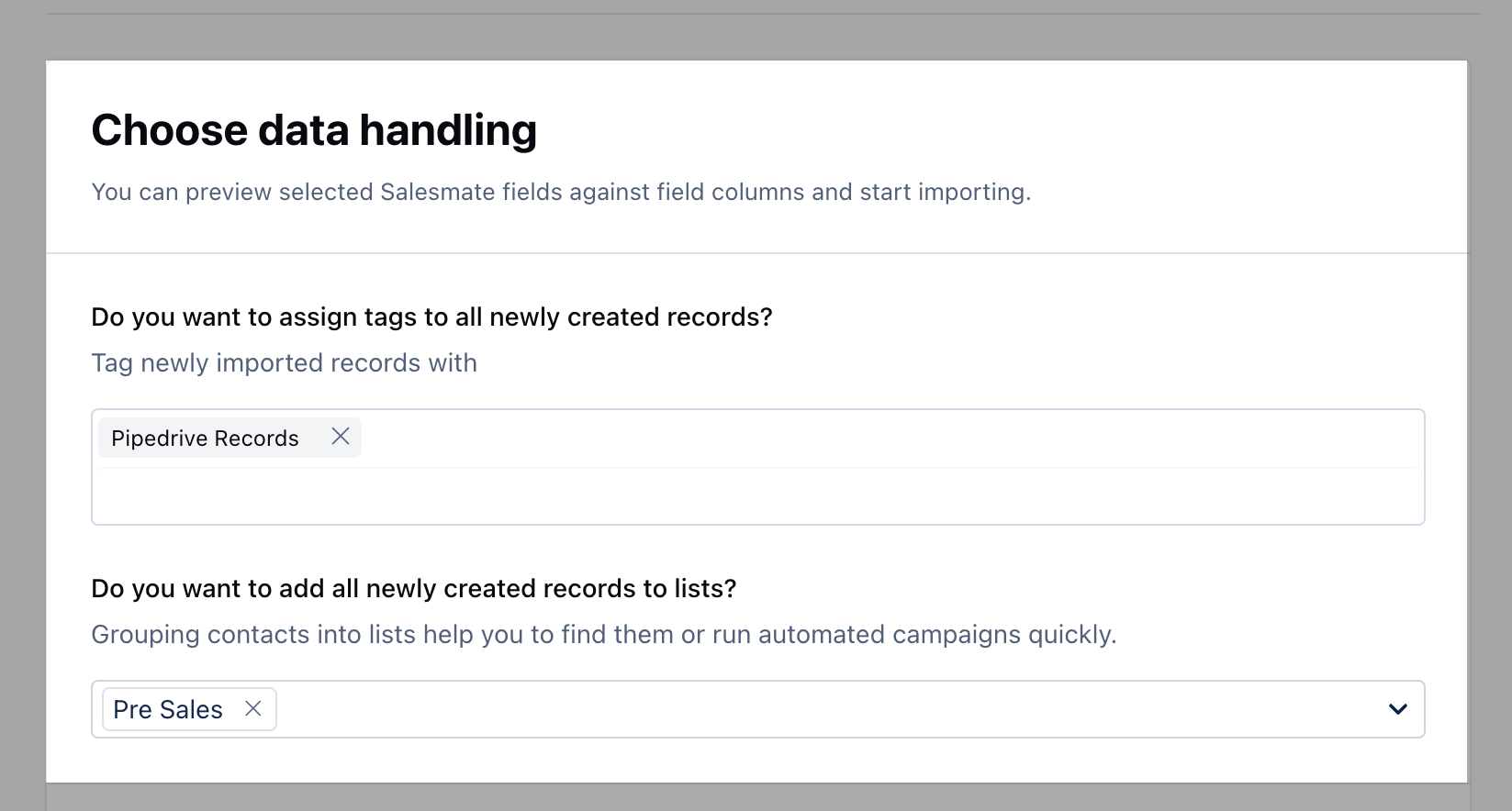 - Salesmate recommends importing a small chunk of records first if you have a large number of records to be imported to check if the records are imported in the way you want in the system