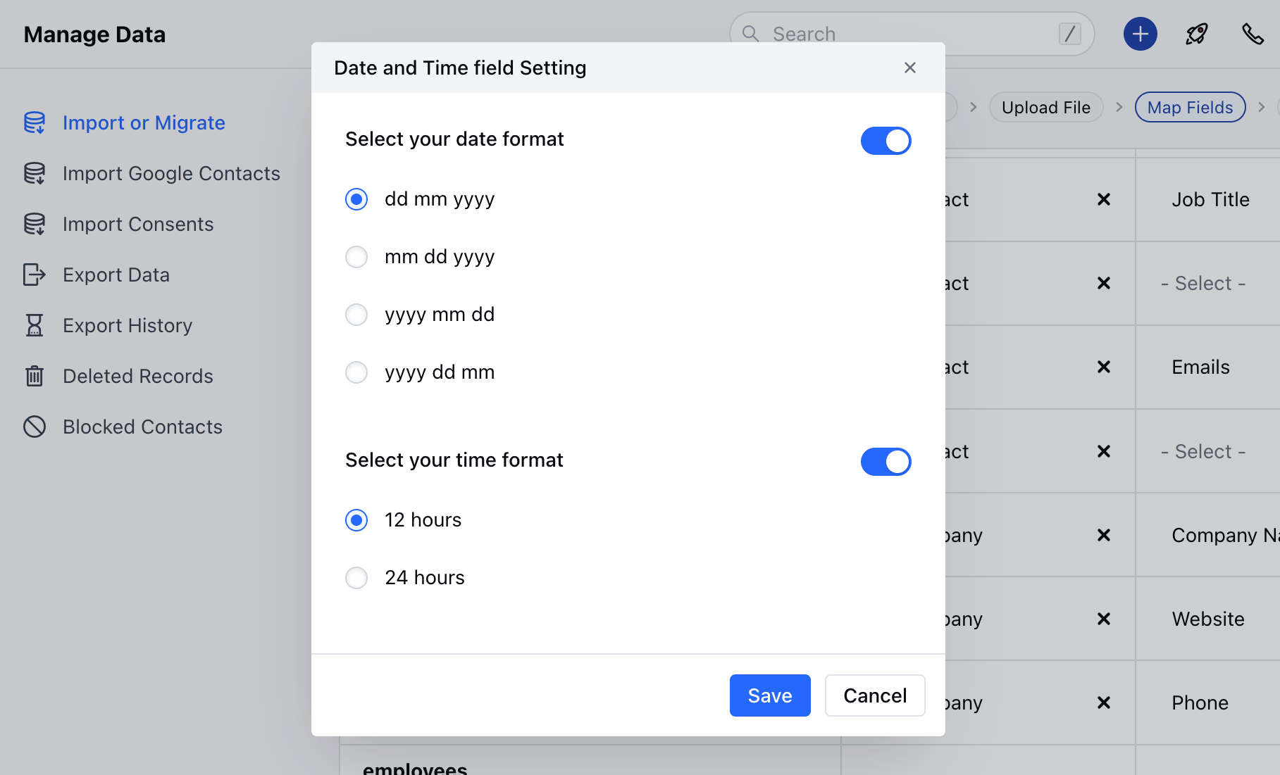 - If similar field names are found in multiple modules, the Field mapping by default will be with the module in order of Contact > Company