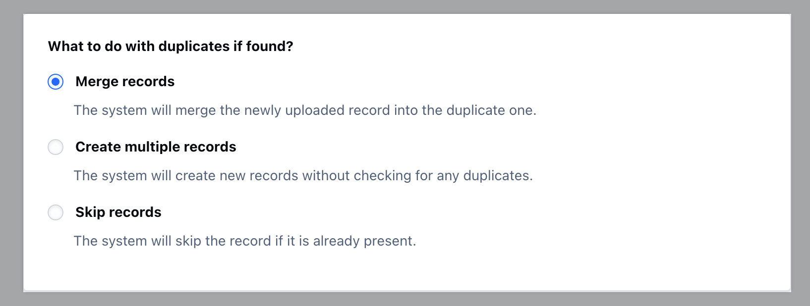 - Merge Records: The system will merge the newly uploaded record into the duplicate one