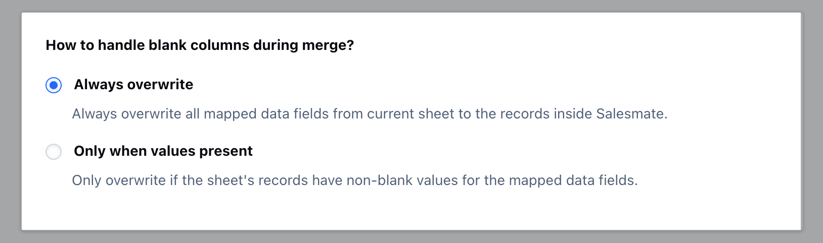 - Always overwrite: Always overwrite all mapped data fields from the current sheet to the records inside Salesmate