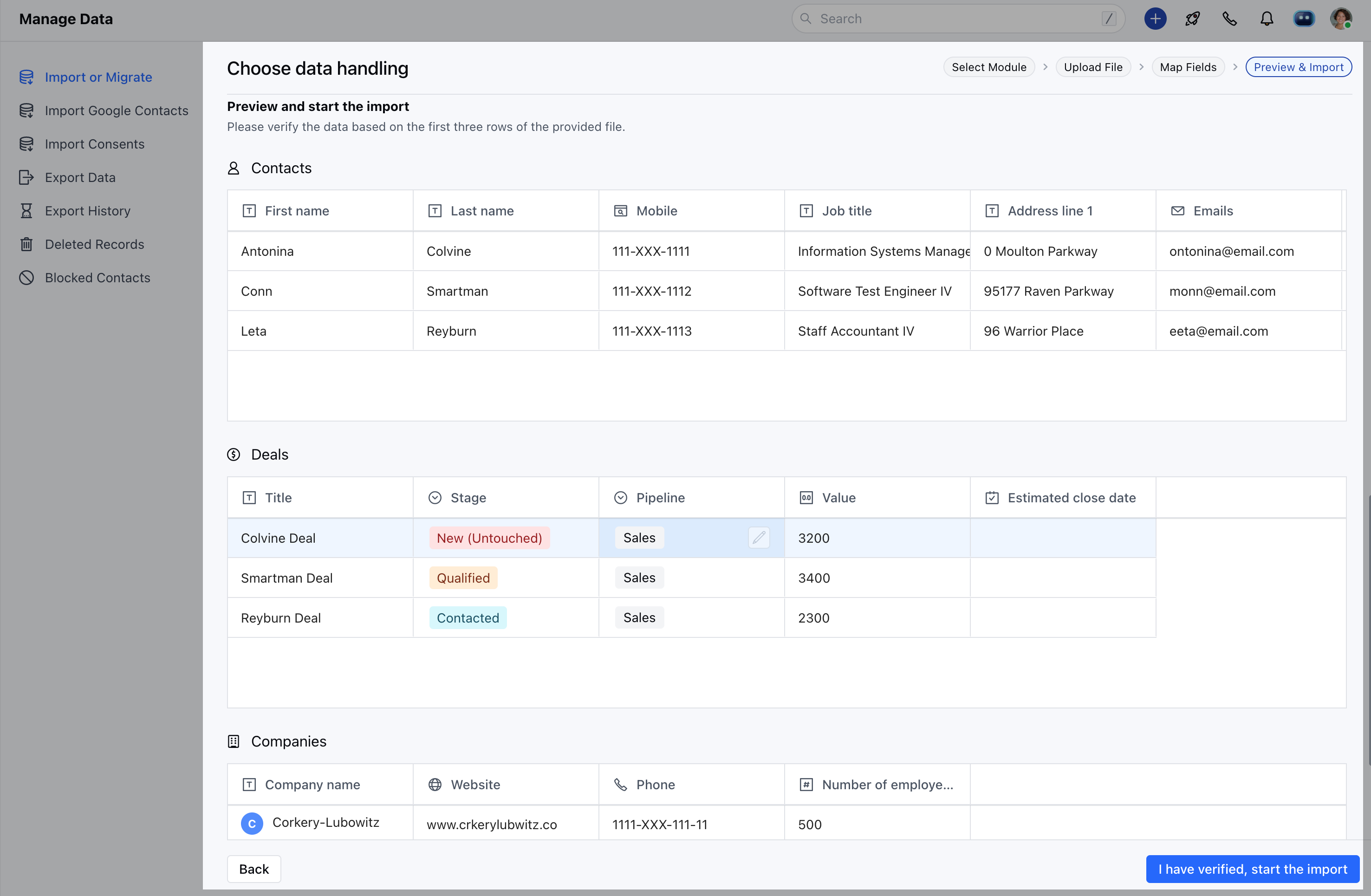 - Contact, Company, Activity, Custom Module or Deal To access import Wizard within Modules: