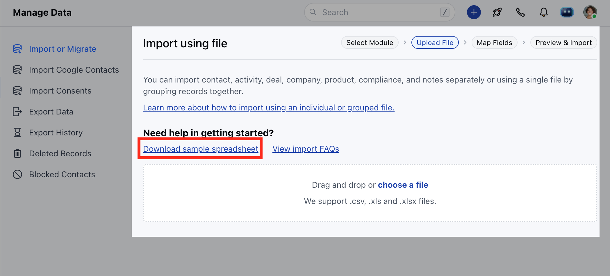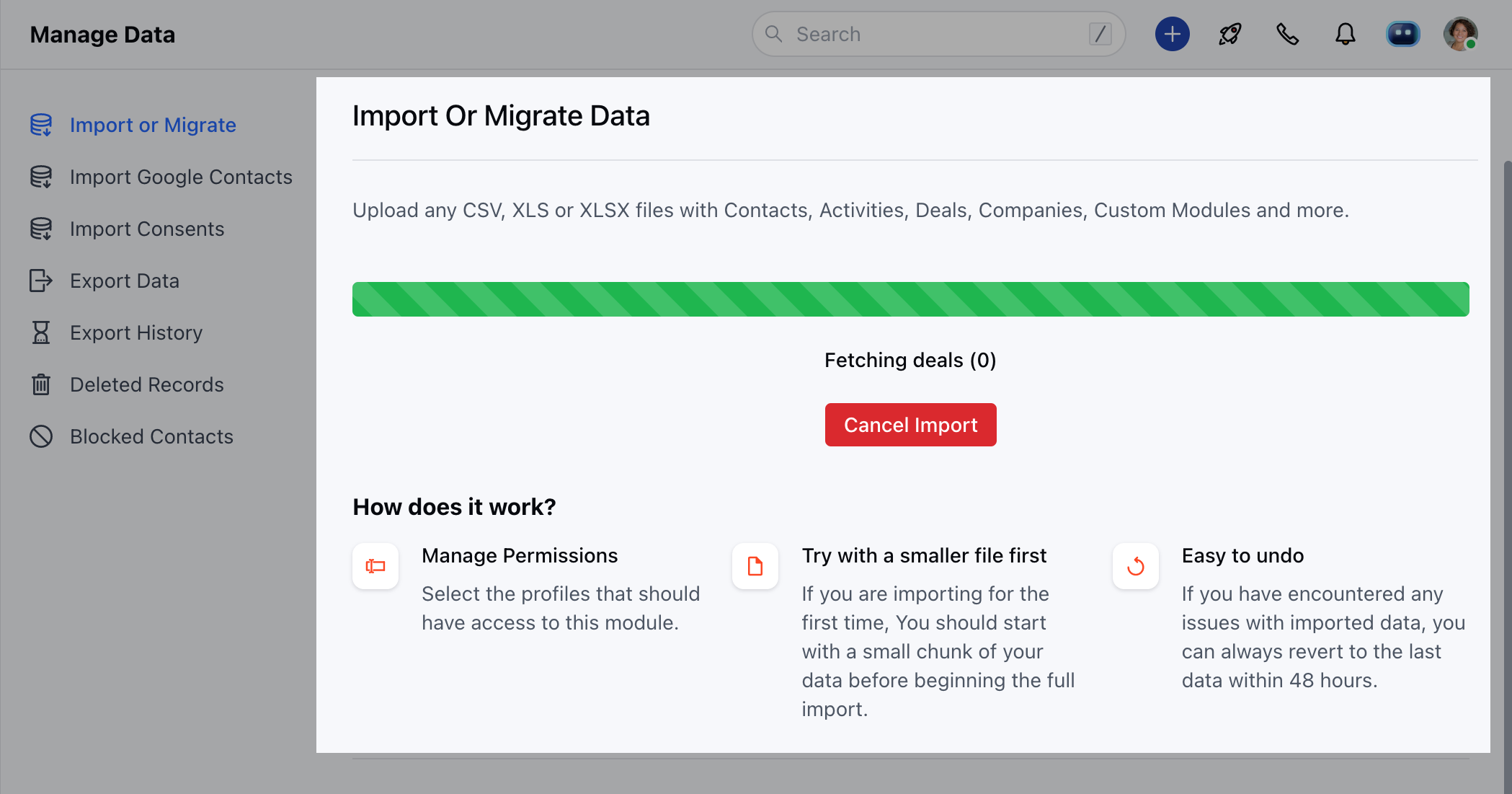 You can import your Contacts,Companies,Deals,Activities records, and **Custom Module,**in Salesmate through a CSV/Excel file (XLS/XLSX).