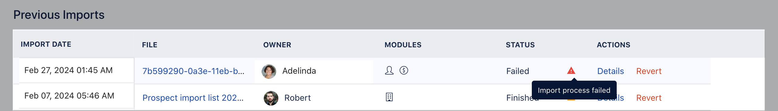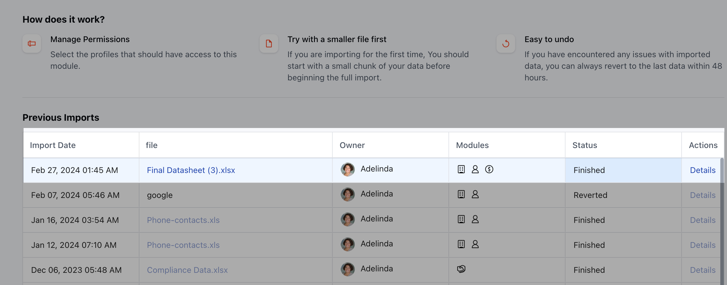 - Below the Progress Bar, you can see the list of your account’s previous imports by your teammates/users with files name