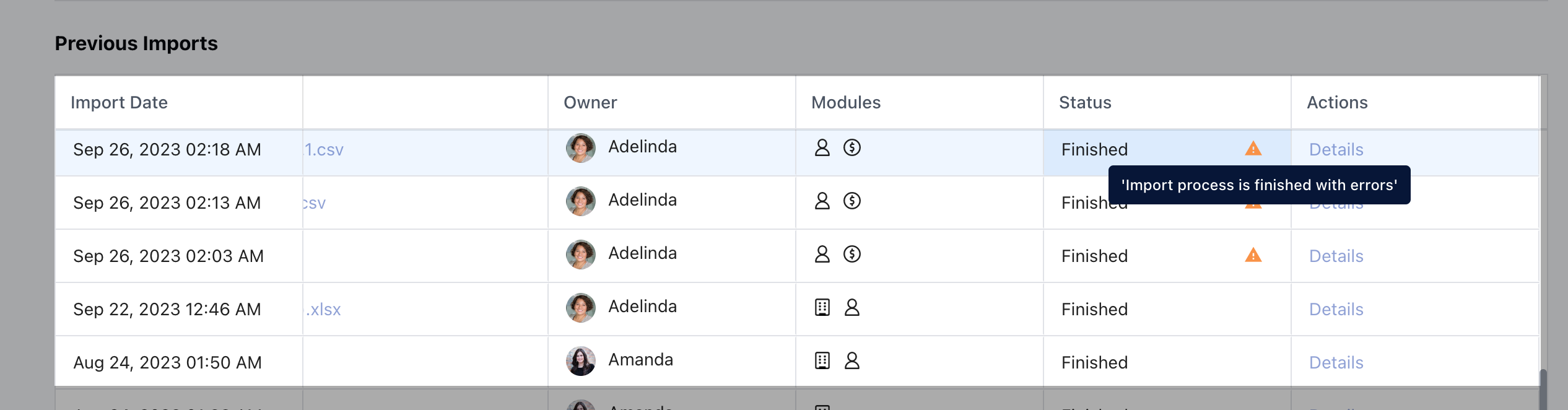 - If the import finishes but with some errors, it will be displayed by a yellow exclamation icon