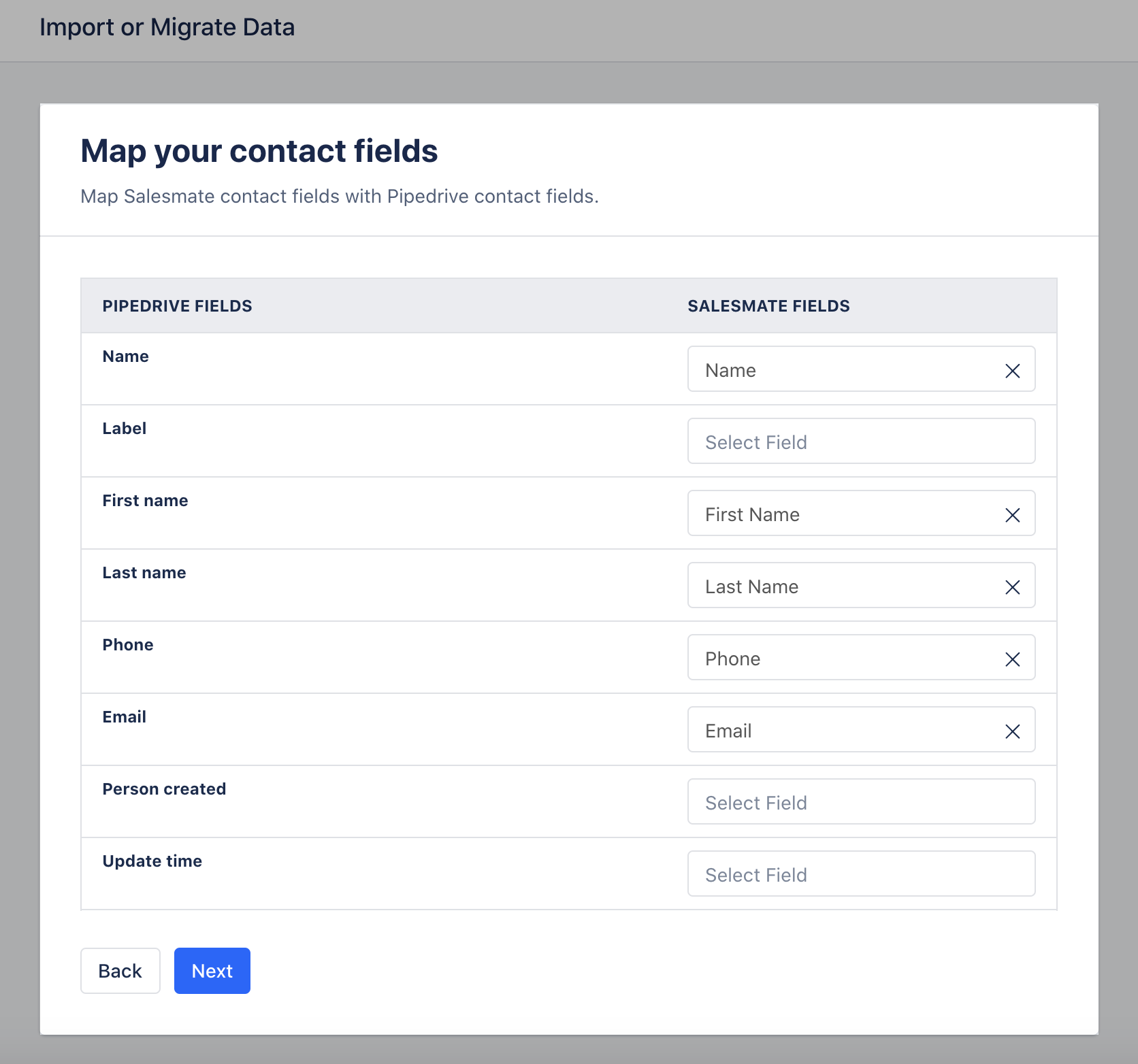 - Salesmate will try to map known columns automatically, the rest of the columns will require manual mapping