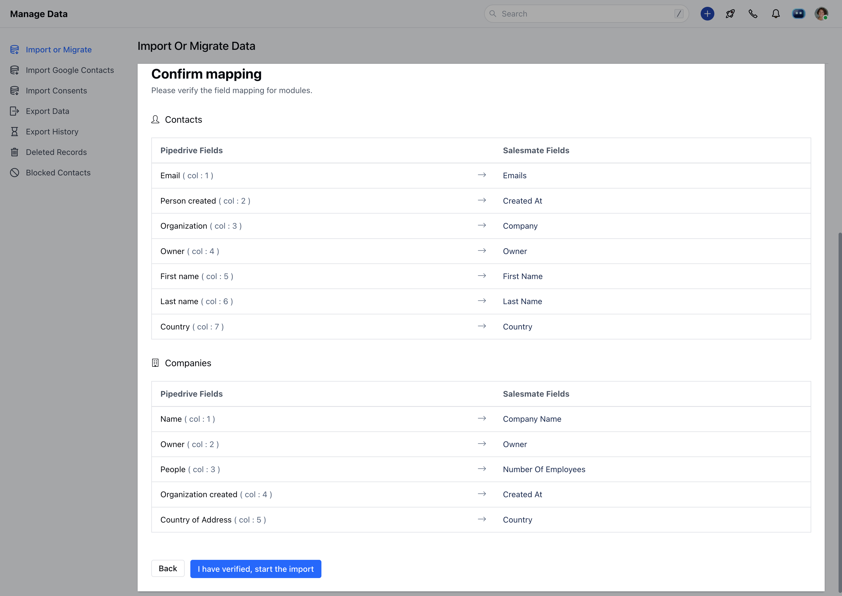 - Before you import the records, ensure that you have created all the Users and Deal-pipelines in your Salesmate account such that the data can be properly associated during import.