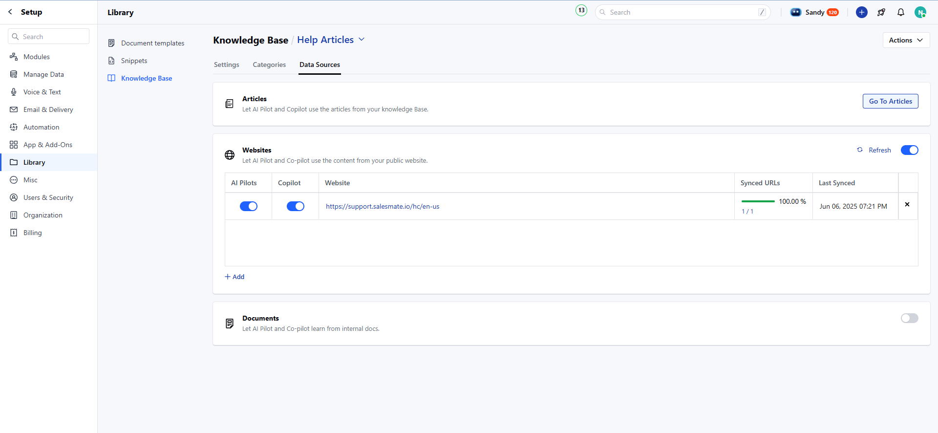 You can sync content from your public website directly into your Knowledge Base to power your AI Pilot and Copilot. This feature helps you pull relevant content automatically from help centers, documentation, or any support-related pages using either a website URL or a sitemap.Steps to Add and Configure Website URLs