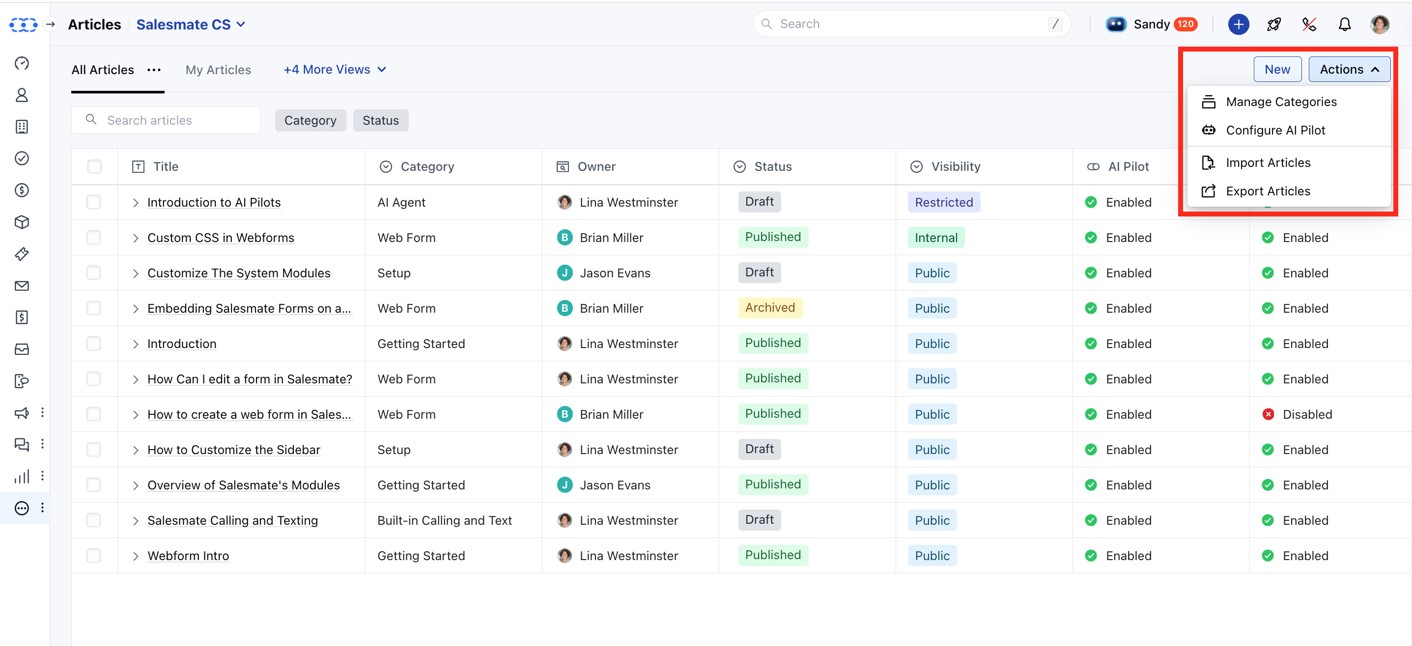 The Actions button on the article listing page provides access to the following operations:- Manage Categories: Redirects to the Organize Categories screen under the Knowledge Base setup, allowing users to manage article categories.