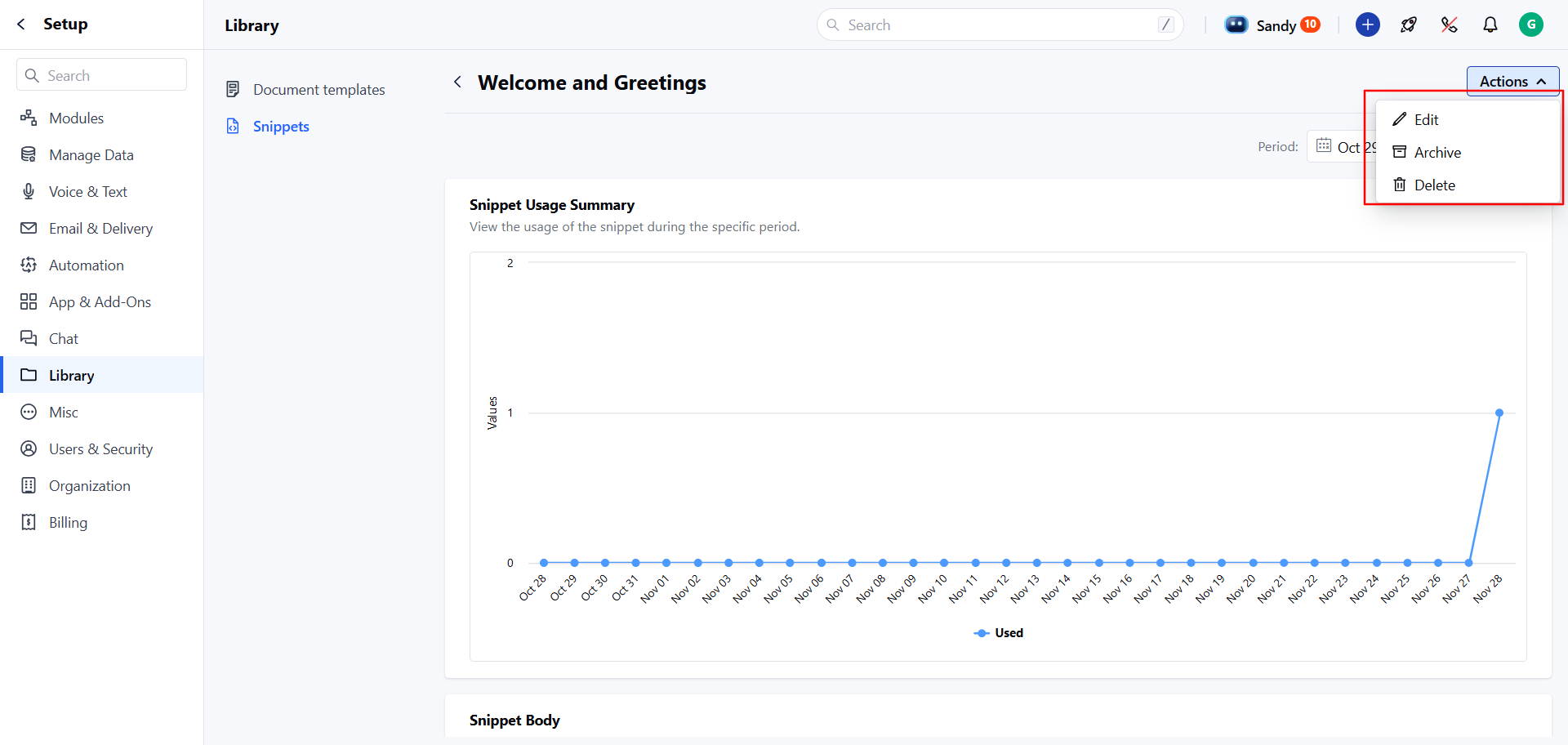 Skip to main contentThe Snippet Detail View allows you to see detailed information about a specific snippet, including its usage statistics and actions you can perform and helps you manage and analyze your snippets effectively, ensuring better utilization and streamlined organization.